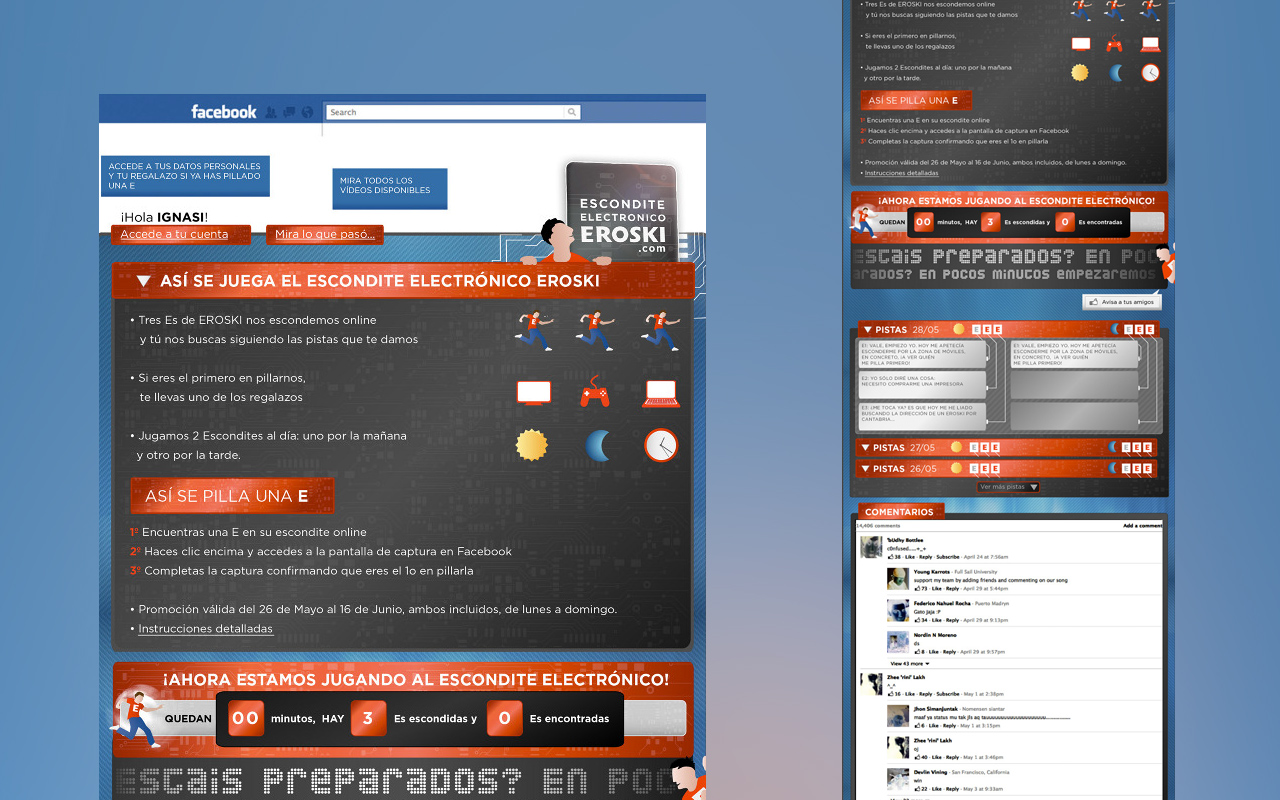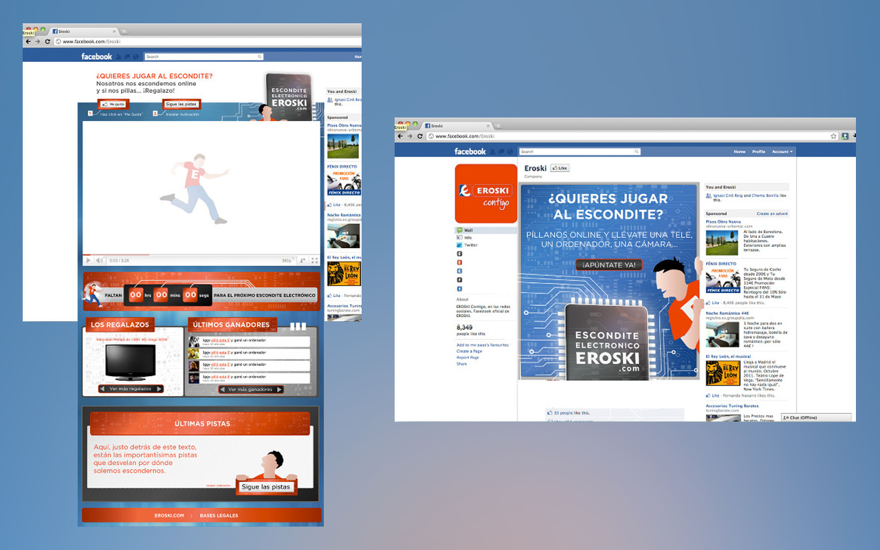 When Honest&Smile was appointed digital agency of EROSKI the brand was well established in TV, but had less than 3.000 likes in Facebook. We created a series of cross-media campaigns to dramatically boost their online presence, and the Facebook-based ‘Hide & Catch’ game was one of them. Prizes were hidden inside videos, websites or posts. But also inside real shops. Traffic was so massive that the whole system went down several times. But we ended up with +50.000 likes.