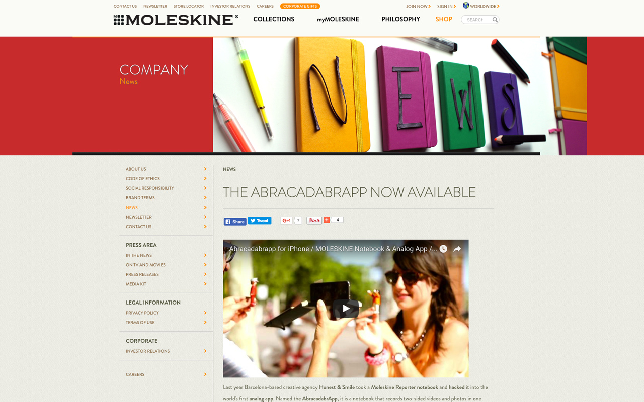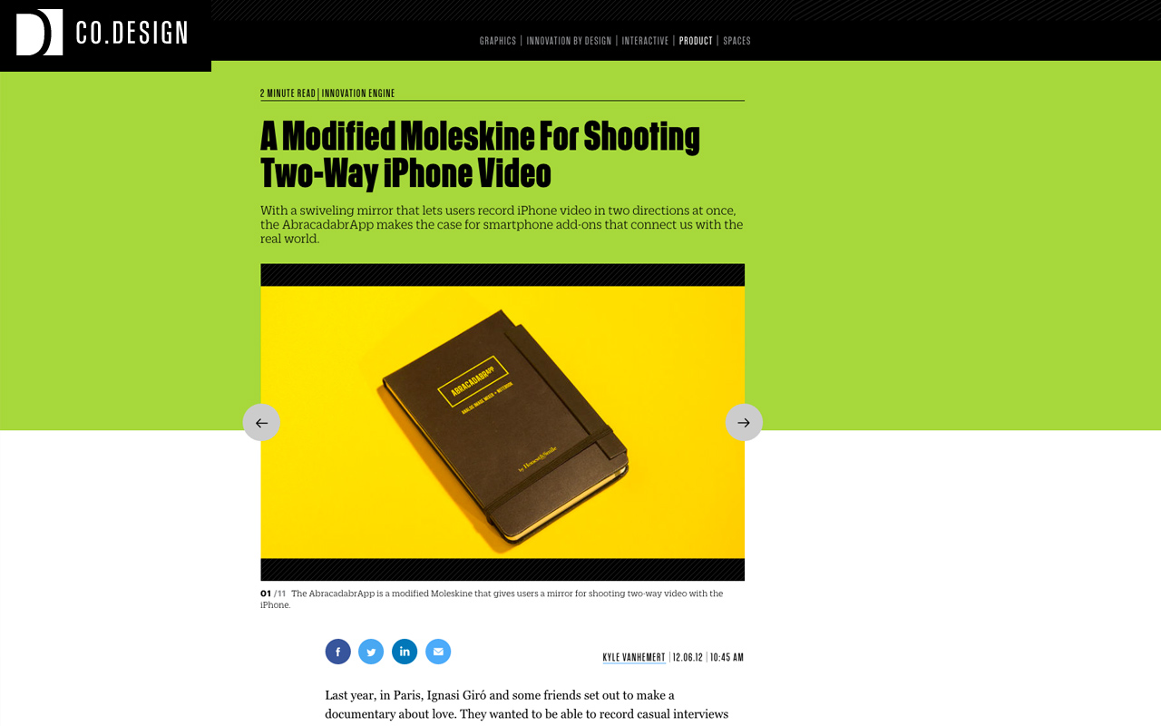 I approached Moleskine with one idea: alter one of their products to create the world’s 1st notebook & analog application, building a solid PR campaign that reinforced their unique positioning in between the digital and the analog worlds. They loved the proposal and the AbracadabrApp was born: A cute contraption, for iPhone, that allowed to manually mix videos and even filter pictures with “Instagram-like” filters.
