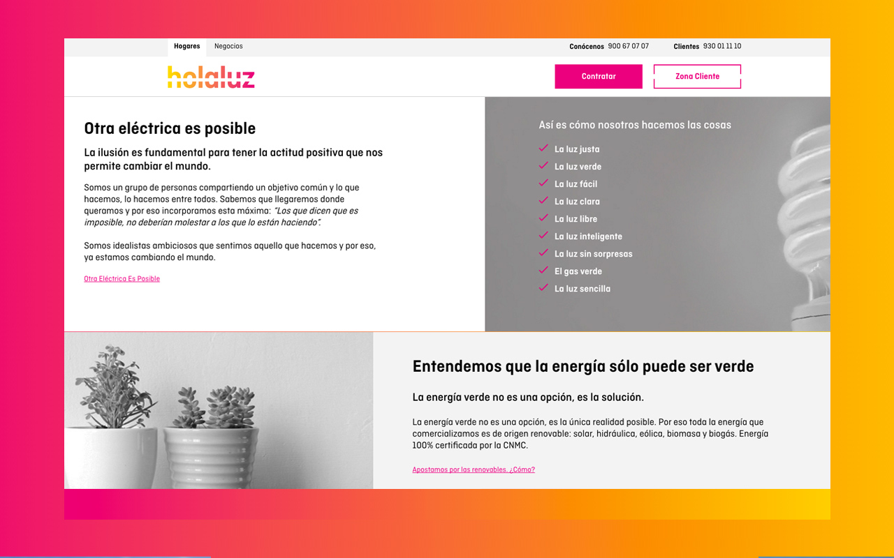 When we first met they were just 4 partners, had no name and wanted to change how things work in the Spanish electricity market. We defined their brand’s story, their name (‘HolaLuz’, literally ‘hello light’ and ‘oh, the light’) and their visual identity. Today, with +100 employees and thousands of clients, they are a respected and loved brand. With a very beautiful name, might I say?
